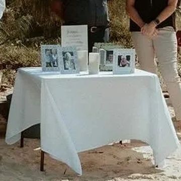 A memorial table or remembrance table is a very special addition to your ceremony space for those couples who have important and special loved ones they would like acknowledged at their wedding. The table is 700mm high and 860mm x 860mm square. The hire includes the table, white linen tablecloth, two LED candles, vase with faux flowers and a sign that reads "In honour of our loved ones who cannot be here with us today, but are forever present in our hearts today and always". Travel negotiated