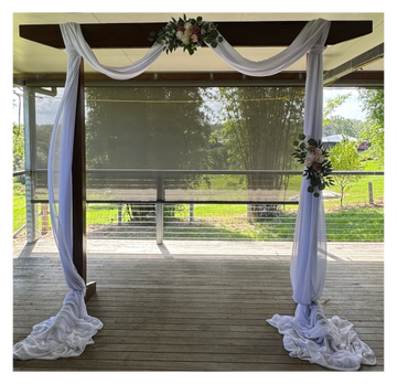 My gorgeous wooden arbour is a real show stopper, measuring 8ft (2.4m) high, and 9ft (2.8m) wide. It offers a generous space for couples to stand under (6ft) during the ceremony and makes a beautiful backdrop for photos. The arbour hire includes 12mtrs of white chiffon, travel up to 50km, setup and packdown. Couples are welcome to organise a floral installation which must be attached using zip ties or florist wire - no, screws or double sided tape.